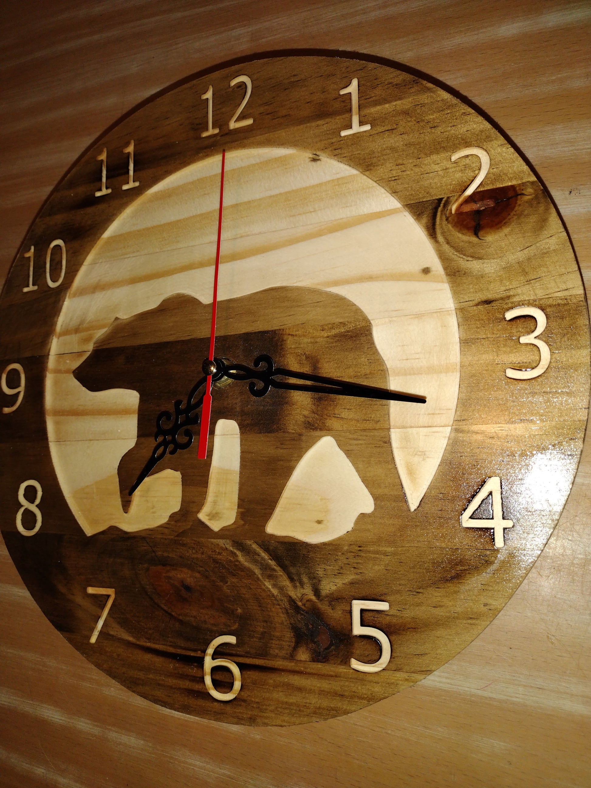 This is a custom CNC carved wood wall hanging clock.